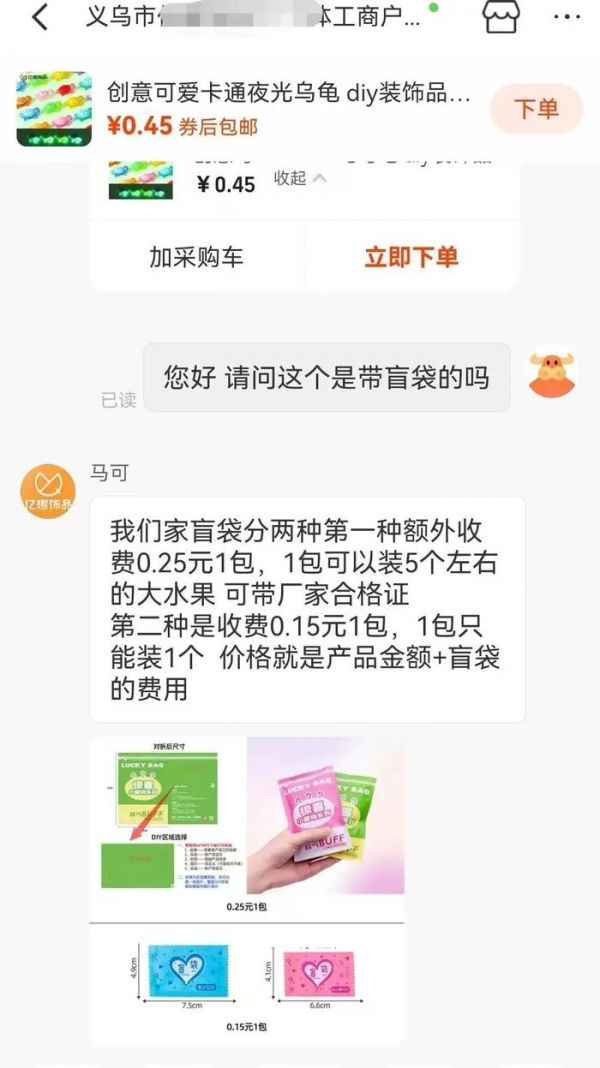 在1688上搜索“夜光树脂乌龟盲盒”便会看到,这些乌龟摆件的商家大多来自义乌,链接显示单一个摆件售价在0.18-0.26元,依据大小不同有所变化。商家也表示最近很多客户都购买的是盲盒版,只要单一个加0.15-0.25元,核算下来不到0.5元便能带走一包乌龟盲盒。