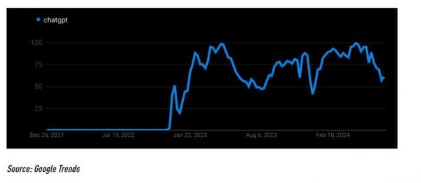 AI 应用活跃用户的增长貌似已经进入瓶颈期。谷歌趋势(Google Trends)数据显示,过去 9-12 个月中,ChatGPT 的活跃用户没有太大增长。