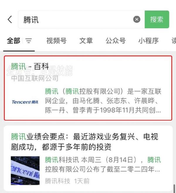 当使用微信搜一搜搜索关键词时,在搜索结果中,出现了一个名为“百科”的新板块。