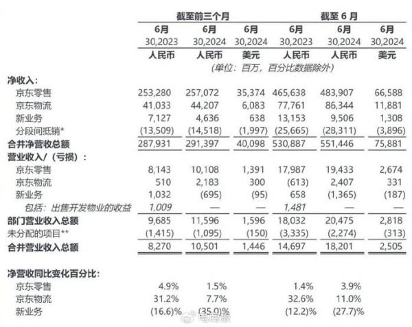 除了新业务出现下滑外,京东零售与京东物流均实现了小幅增长。
