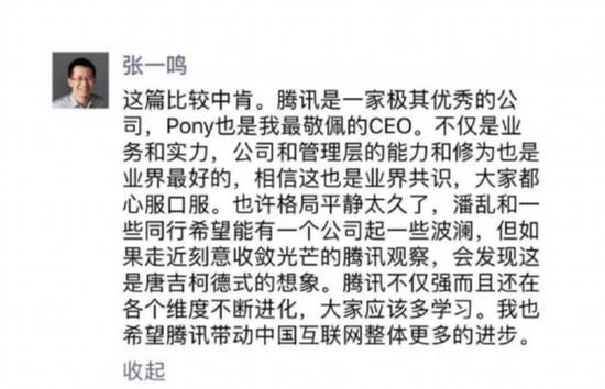 [CNMO科技消息]最近,张一鸣发朋友圈称,腾讯是一家极其优秀的公司,Pony也是我最敬佩的CEO。不仅是业务和实力,公司和管理层的能力和修为也是业界最好的,相信这也是业界共识,大家都心服口服。也许格局平静太久了,一些同行希望能有一个公司起一些波澜,但如果走近刻意收敛光芒的腾讯,会发现这是唐吉柯德式的想象。腾讯不仅强而且还在各个维度不断进化,大家应该多学习。我也希望腾讯带动中国互联网整体更多的进步。