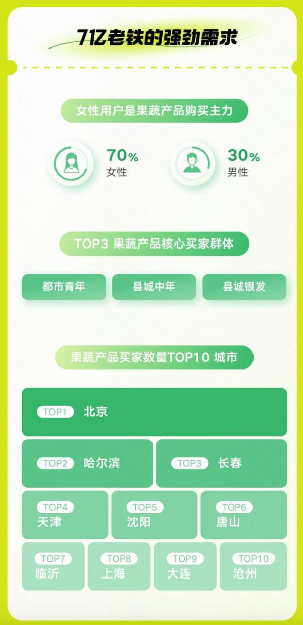 丰富的商品供给有效提升了果蔬买家在快手平台的渗透率,且逐渐成为主播直播间吸引新用户的有力手段。上半年,北京、哈尔滨、长春登上快手果蔬买家数量前三甲城市。