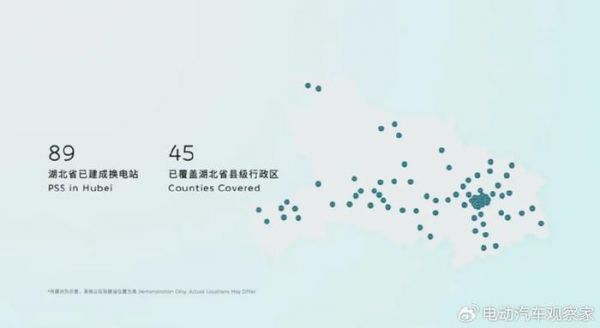 或许是怕大家对数字并不敏感,李斌还以湖北省为例做了前后对比。下图是目前湖北省内89个蔚来换电站所在地点和密度,已经实现了对省内45个县的覆盖。