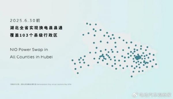 接下来,是2025年6月30日之前,完成换电县县通之后,湖北省省内全部蔚来换电站分布的地点和密度示意。