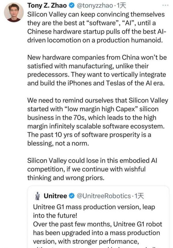 「硅谷可以一直相信自己在“软件”、“人工智能”领域是最好的,直到一家中国硬件初创公司在可量产的人形机器人上实现了最好的AI驱动的运动控制。