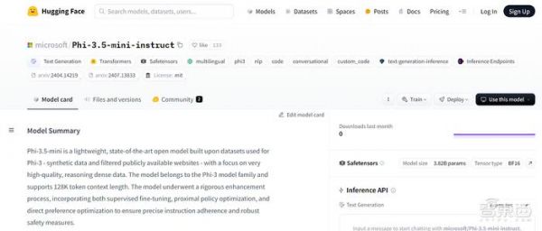 ▲Phi-3.5-mini-instruct的Hugging Face页面(图源:Hugging Face)Phi-3.5-vision-instruct模型训练耗时更短,仅为6天。其数据量为5000亿个token,训练过程中使用了256个英伟达A100-80G GPU。
