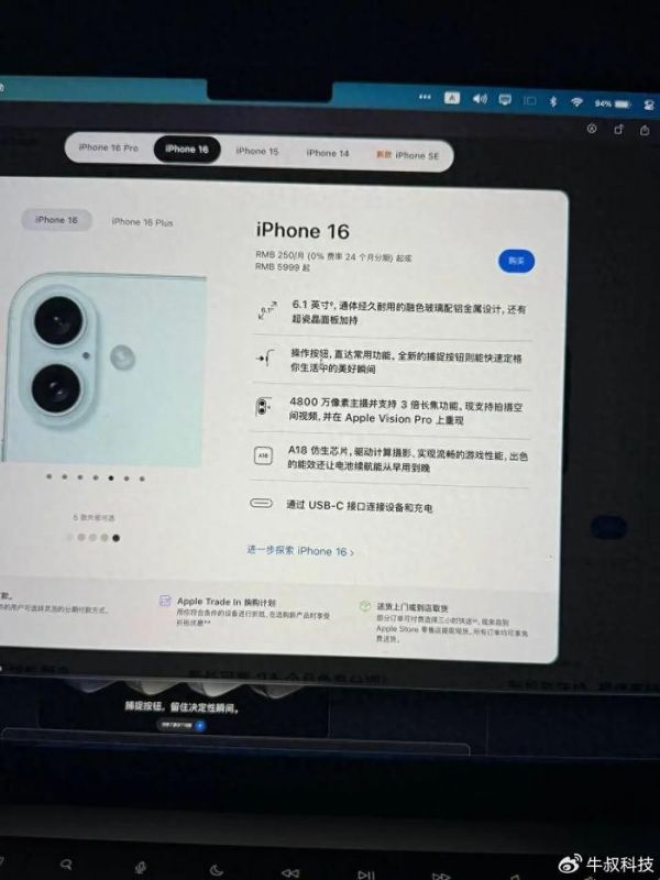 第一张图片是 iPhone 16 的简要规格表,显示的是垂直排列的摄像头。据介绍,该机配备 6.1 英寸显示屏,铝合金和玻璃机身,侧面有一个操作按钮,甚至还有售5999元的售价。据说它还包括可为Apple Vision Pro拍摄视频的 4800 万像素摄像头,以及 A18 芯片和 USB-C 连接。
