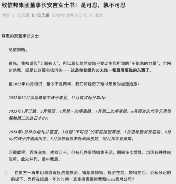 这封名为《致信邦集团董事长安吉女士书:是可忍,孰不可忍》的公开信中,刘光耀围绕两人从相识、结婚到投资、借款的始末都作了解释,同时他强调“投资在前,婚姻在后,公私分明,为何婚后一直拿撤资绑架自己和公司。”