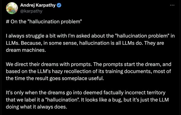 Andrej Karpathy对幻觉问题也有过详细阐述,他表示:“只有当梦境进入被认为事实不正确的领域时,我们才会将其称为“幻觉”……这看起来像一个bug,但这只是LLM在做它一直在做的事情。”