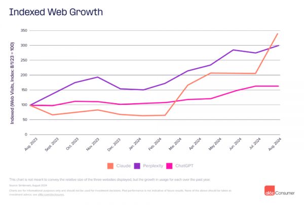 Perplexity 目前位列网页搜索第三位——这款 AI 驱动的搜索引擎致力于提供简洁、实时且准确的查询答案,并附有引用来源。根据 Similarweb 数据,Perplexity 在访问时长上略胜 ChatGPT(超过七分钟),表明用户深度参与其中。此外,Perplexity 首次跻身移动端前 50 名榜单。