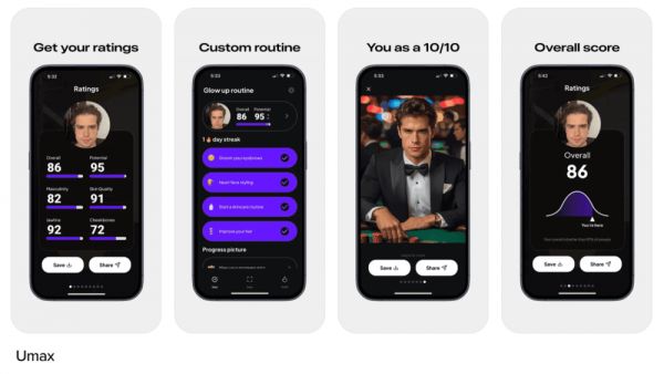LooksMax 和 Umax 两款应用会读取用户照片进行评分,并提供“变美小贴士”。Umax 还能生成用户颜值满分的虚拟形象,而 LooksMax 则通过分析用户声音来评估吸引力。在应用的引导页面上,LooksMax 宣称拥有超过 200 万用户,Umax 则声称有 100 万用户。