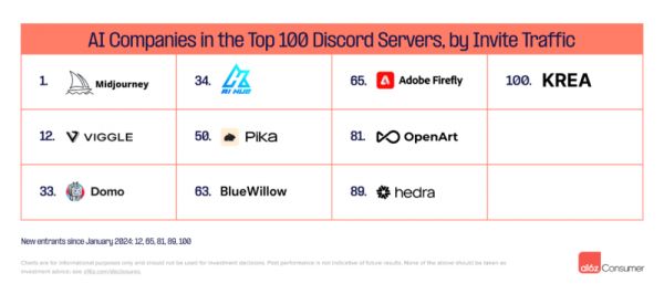 截至 7 月,有 10 家 AI 公司跻身所有 Discord 服务器邀请流量前 100 名。与 1 月相比,其中一半为新晋者: