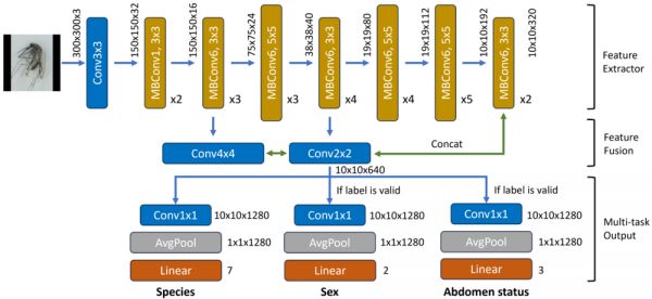 VectorBrain是一个多任务EfficientNet架构,专为蚊子分类设计,同时输出种类、性别和腹部状态。该架构包括一个特征提取器和一个分支结构,每个分支对应一个分类任务。