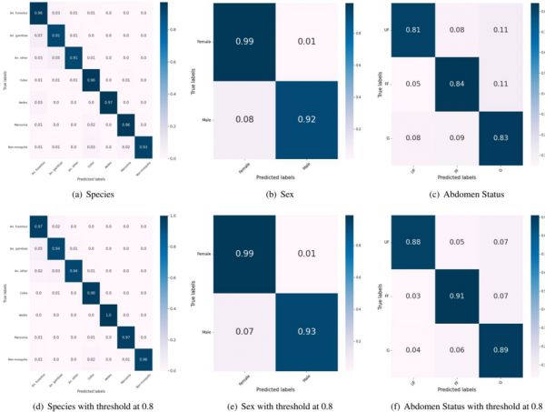 图片展示了该网络如何在不同层次「感知」蚊子的特征,并通过直观的方式显示出其种类、腹部状态、性别分布情况