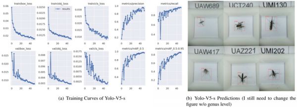 (a)为YOLO模型在训练和验证中的性能指标,(b)为模型检测蚊子案例