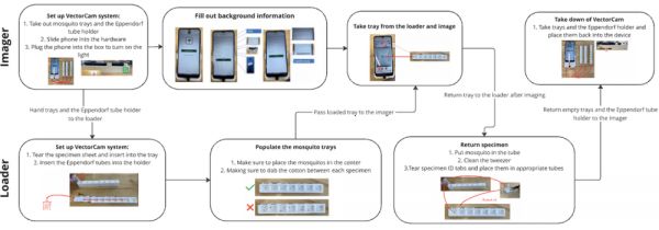 具体而言,VectorCam包括一套专门的成像设备和一款手机应用程序。其中的硬件组件包括内置15倍微距镜头的灯箱、手机壳设计和扩展坞。硬件还包括Eppendorf管支架和蚊子托盘以及穿孔标本ID表,更好地储存这些蚊子。