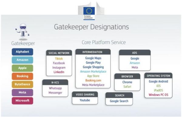 目前,包括谷歌、亚马逊、苹果、字节跳动、Meta和微软在内的六家大型数字平台公司及其提供的22种产品,已经被欧盟认定为具有“守门人”实力,受到了严格的监管。
