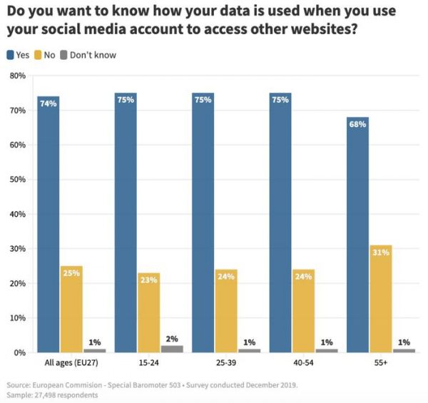 美国商业媒体CNBC援引2019年12月的一项调查显示,74%的欧洲公民希望了解社交媒体平台如何使用他们的数据,尤其是当他们访问其他网站时。此外,15至54岁的人群尤为关注如何更好地控制个人信息的使用权。