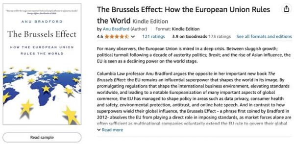 然而,哥伦比亚大学法学教授Anu Bradford在《布鲁塞尔效应》一书中提出了相反的观点:欧盟仍然是一个有影响力的超级经济体,它以自己的形象塑造世界。