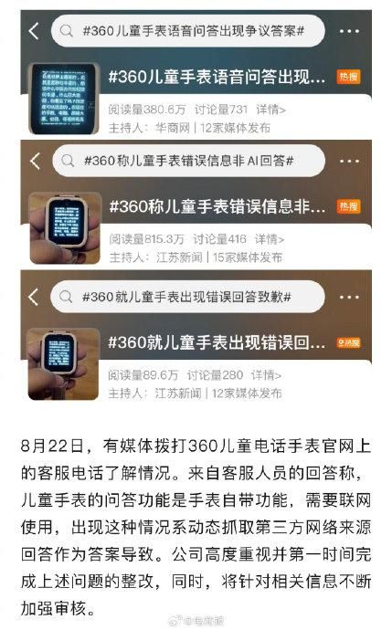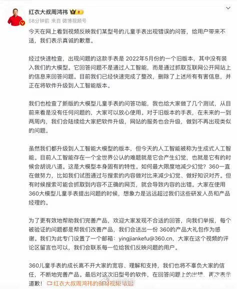 #周鸿祎就儿童手表现争议言论道歉# 360儿童手表智能回答出现不当言论,周鸿祎公开致歉。