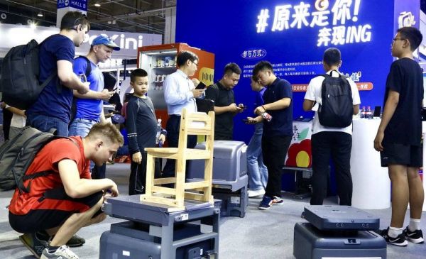 在走出展厅后,我遇到了一群群带着旗帜合照的小朋友,起初我以为这些小学生只是来参加研学活动。上前攀谈后,我才发现原来他们都是带着自己的机器人来参加机器人大赛的选手。