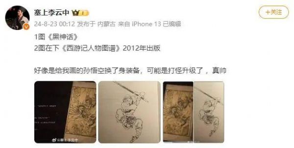 8月23日凌晨,“塞上李云中”发布微博,附上了《黑神话:悟空》中的“大圣残躯”篇的图片,与其在2012年出版的《西游记人物图谱》中的孙悟空姿势相近,称“好像是给我画的孙悟空换了身装备”。