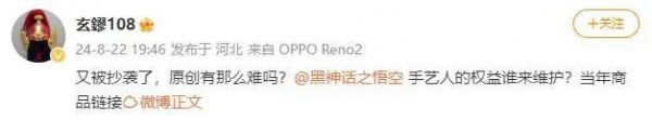 就在这前一天,微博认证为三级工艺大师的博主“玄鏐108”发布微博,贴出《黑神话:悟空》杨戬的臂鞲与其过往设计的臂鞲作品的对比图,感叹“又被抄袭了,原创有那么难吗?”接着,有博主发布视频,用视频一一对《黑神话:悟空》游戏里杨戬的臂鞲与博主过往作品细节对比,佐证抄袭之处。