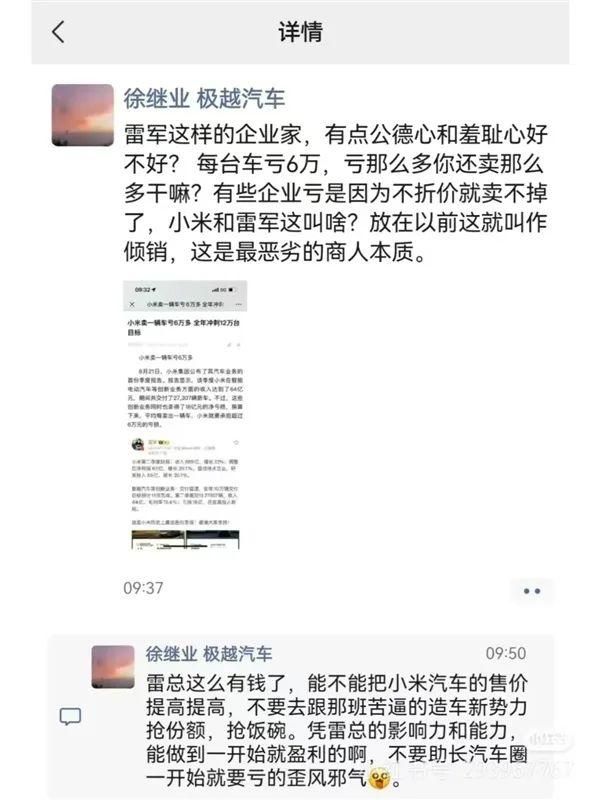 昨日,极越公关负责人徐继业在朋友圈对小米汽车及雷军进行了言辞激烈的言语攻击,网传截图显示,徐继业质问:雷军这样的企业家,有点公德心和羞耻心好不好?每台车亏6万,亏那么多你还卖那么多干嘛?有些企业亏是因为不折价就卖不掉了,小米和雷军这叫啥?放在以前这就叫作倾销,这是最恶劣的商人本质。