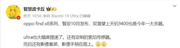 博主@智慧皮卡丘 近日的一份爆料中提到,OPPO Find X8/X8 Pro暂定10月发布,“双潜望上天玑9400也是今年一大杀器。”