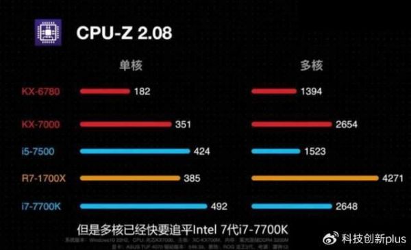 还有人拿KX-7000和其它处理器对比过,KX-7000的多核实际上达到了intel 7代酷睿的顶级水平,也就是和 i7-7700K的性能差不多了,这个用于日常娱乐、工作也是没什么问题的。