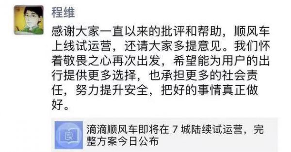 对此,滴滴CEO程维在朋友圈发文,表示感谢大家一直以来的批评和帮助,顺风车上线试运营,请大家多提意见。
