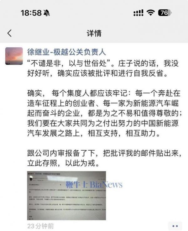 8月22日晚间,据《鞭牛士》报道,极越汽车公关负责人徐继业被极越汽车CEO夏一平内部通报处罚,根据处罚通报显示,夏一平称徐继业言论不代表公司观点,也不符合公司价值观。现已经对相关部门严厉批评,将进一步要求公司员工严守传播纪律。