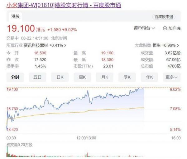 因为财报的利好消息冲击,小米股价也迎来了久违的大涨,这对雷军来讲,算得上是大喜事一件,来看具体盘面数据: