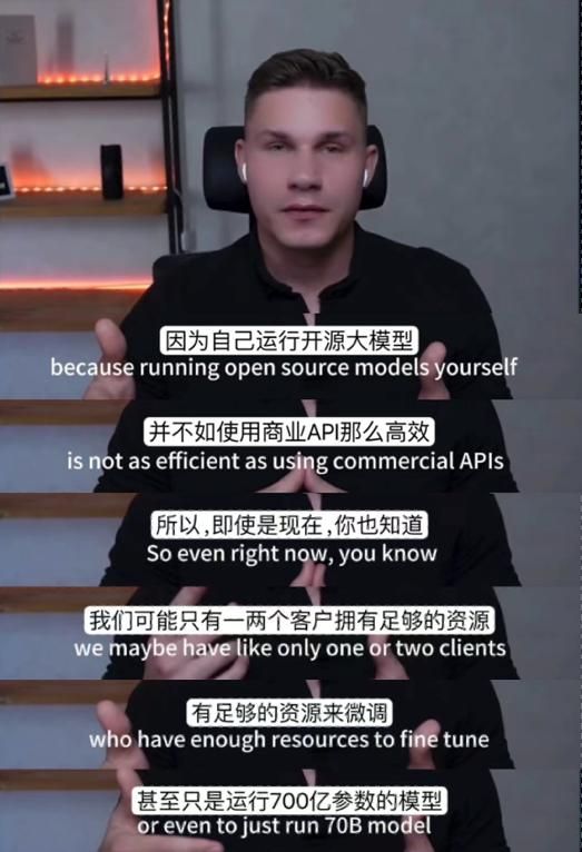当时,一位美国AI创业者Arsenii Shatokhin的采访视频在网上流传,这位创业者表示,“我们只有一两个客户有足够资源,来精调或运行700亿参数的Llama开源模型。”