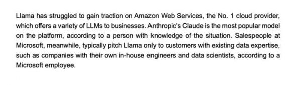 “我们只会向具备数据专业知识的客户推销Llama,比如内部有工程师和数据科学家的公司。”据The Information报道中,微软员工这样向媒体表示。