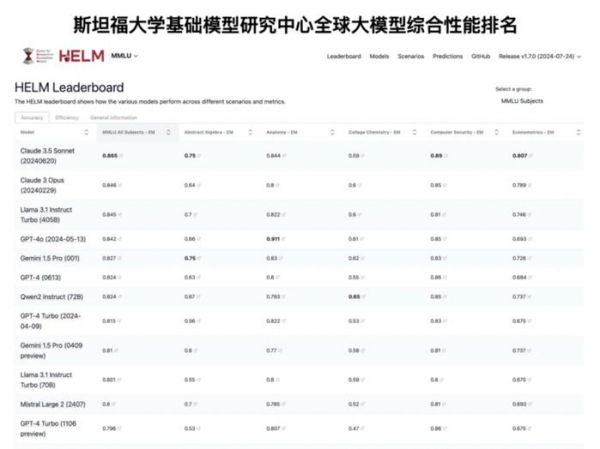 但迄今为止,闭源模型性能整体领先于开源。在斯坦福大学7月公布的大规模多任务语言理解 (MMLU)测试排名中,排名前十的模型中,仅有Llama 3.1为开源,其余9款上榜模型均为闭源。