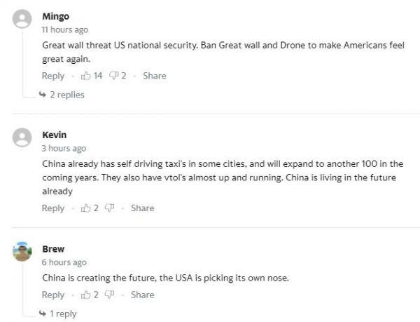 “中国已经在一些城市推出了自动驾驶出租车,未来几年将扩大到100辆。它们的垂直起降也快启动了。中国已经生活在未来。”