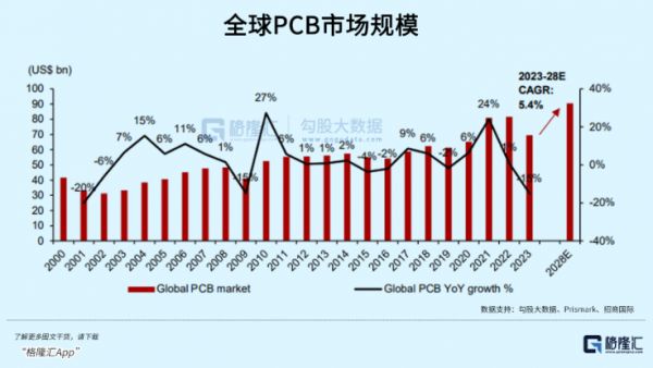 此次业绩增长可以说是去年终端需求下滑产能过剩的反转。根据Prismark数据,2023年全球PCB行业产值同比下降15%至695亿美元。