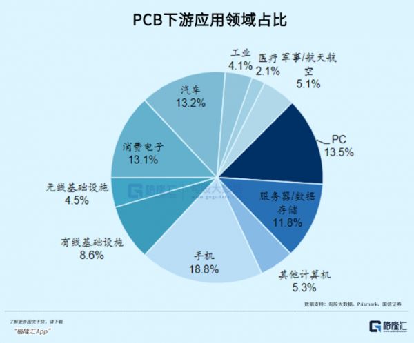 PCB的主要原材料覆铜板是由铜箔、木浆、环氧树脂、玻纤等常见材料制成。2023年PCB下游市场中,手机、PC、汽车、消费电子、服务器、有线基础设施分别占比18.8%、13.5%、13.2%、13.1%、11.8%、8.6%。