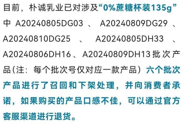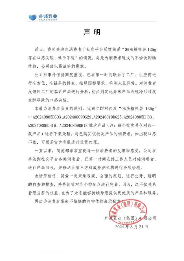 朴诚乳业表示,在收到消费者对于产品的反馈后,随即与相关工厂和供应商进行了全面的检查和排查。所有产品均按照国家标准进行了检测,结果显示并无异常。