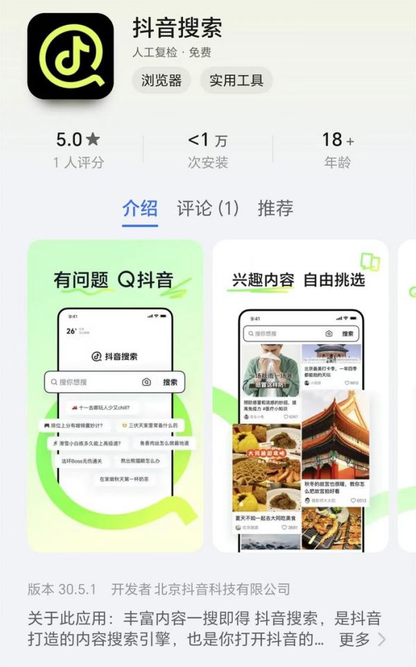 只看名字可能会以为这又是一款类似于“头条搜索”的换皮App,但据官方介绍,抖音搜索与百度、夸克等由网站服务商提供的展示内容不同,展示内容主要是由博主创作的短视频、图文等内容为主。