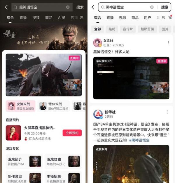 为了方便大家进行对比,小雷特意截取了抖音搜索和抖音对黑神话悟空的搜索内容。可以看到两者搜索逻辑确实很像,同样是优先展示直播,紧接着是商品,最后才是内容。只不过经过刷新,抖音搜索顶部会展示不同内容,且短视频的权重明显加强;抖音专区和商品则不变,下方内容会刷新。