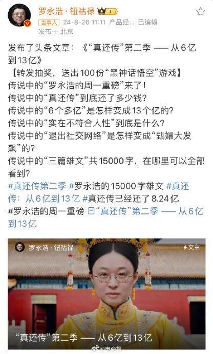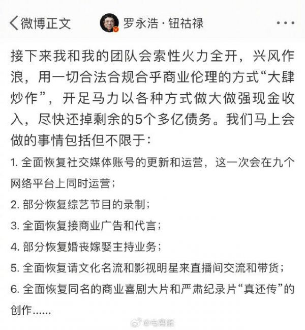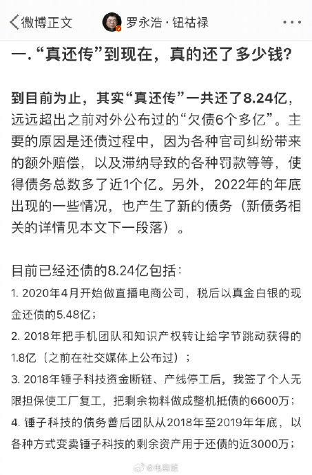#罗永浩称已还债8.24亿# 罗永浩再发万字长文:共还了8.24亿,将火力全开兴风作浪,大肆炒作,尽快还掉剩余的5个多亿债务。#罗永浩官宣真还传第二季#