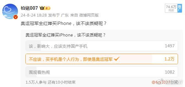 数年前武汉一火锅店老板因买iPhone11奖励员工被他们逼迫得道歉,如今奥运冠军全红婵再买iPhone而不是国产手机,他们试图再次裹挟大众,然而从大众的投票来看,支持他们的人已没多少了,说明人们觉醒了。