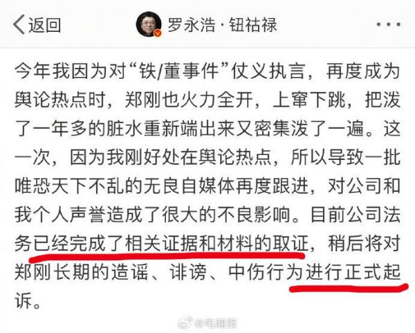 #罗永浩回应郑刚指控# 罗永浩长文回应投资人郑刚指控:长期造谣,将起诉。