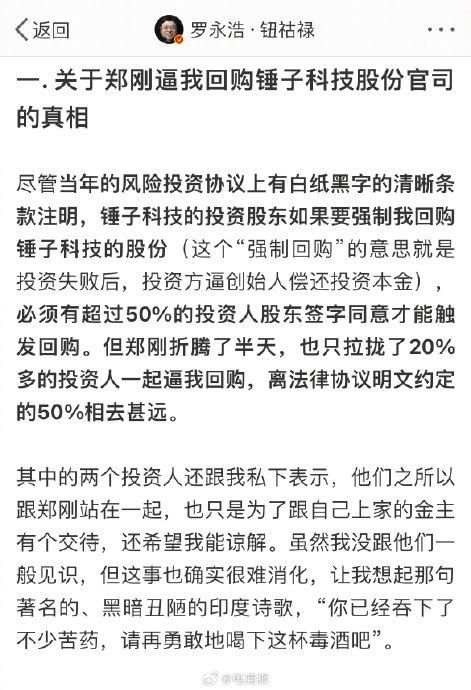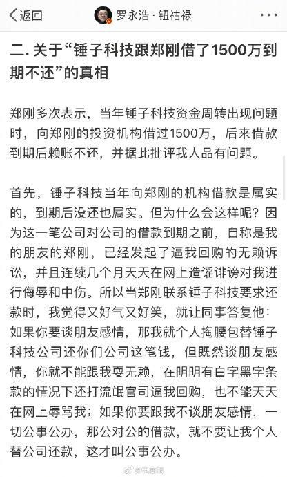 锤子科技投资人郑刚又又又发文“声讨”罗永浩:约谈还款事宜再度……