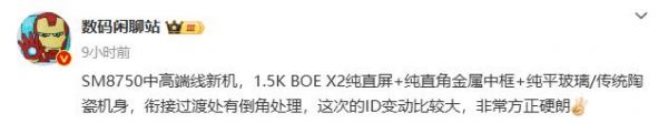 今日,据博主@数码闲聊站 透露,某SM8750(骁龙8Gen4代号)中高端线新机,采用1.5K BOE X2纯直屏+纯直角金属中框+纯平玻璃/传统陶瓷机身。