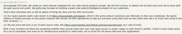 Eric Fritz 的这篇文章在 Hacker News 上引起开发者热议,不久后 Sourcegraph CEO(ID 为 sqs)也在该帖下进行了解释:之所以私有化代码库,是为了集中精力开发更好的产品。