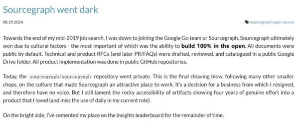 可如今,Sourcegraph 的代码库私有化,这一举措让 Eric Fritz 感到遗憾,他认为这抹杀了公司过去所建立的开放文化。虽然他已从公司离职,但仍对自己四年来为该产品所付出的努力及其成果的可访问性感到惋惜。
