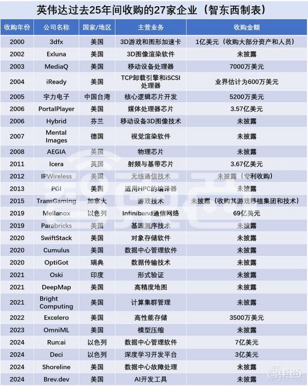 ▲英伟达过去25年间收购的27家企业(制表:智东西)